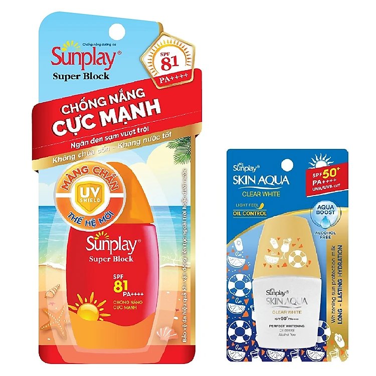 - Sữa Chống Nắng Cực Mạnh Sunplay Super Block SPF81, PA++++ (30g) với khả năng chống nắng cực mạnh và hiệu quả trong nhiều giờ liền, tính kháng nước và mồ hôi cao, bảo đảm hai tác động bảo vệ da và nuôi dưỡng da khi phải vận động liên tục ngoài trời hoặc dưới nước.