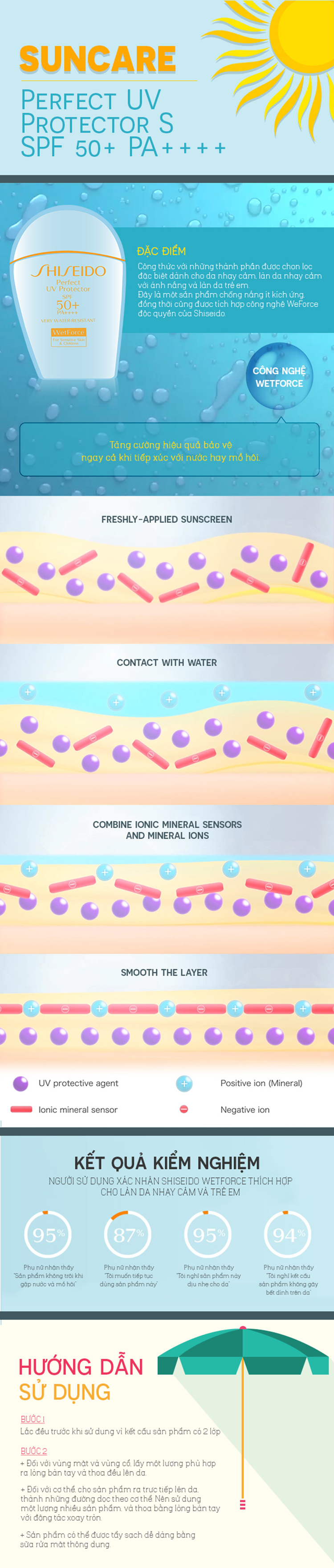- Sữa Chống Nắng Shiseido Perfect UV Protector S (50ml) - 11953 ứng dụng công nghệ WetForce có khả năng bảo vệ da hiệu quả hơn khi tiếp xúc với nước. Sau khi tiếp xúc với nước, các ion âm trong công thức ổn định Ionic Mineral Sensor sẽ gắn kết với những ion dương của khoáng chất trong nước hay mồ hôi và biến đổi chúng thành một phần của lớp màng không thấm nước, củng cố thêm rào chắn bảo vệ da khỏi tia UV.
