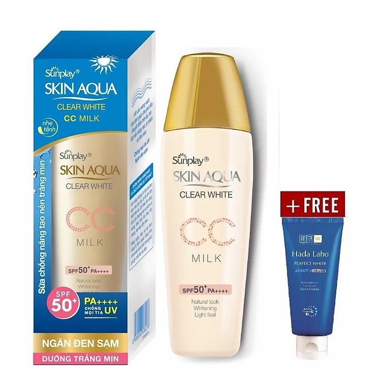 - Sữa Chống Nắng Dưỡng Da Và Trang Điểm Nhẹ Sunplay Skin Aqua Clear White CC Milk SPF50+, PA++++ (25g) có khả năng chống nắng tuyệt vời và hiệu quả trong nhiều giờ liền, đồng thời mỏng mịn, nhẹ tênh như một lớp nền hoàn hảo để bạn thoải mái make-up mỗi khi xuống phố vào ban ngày.
