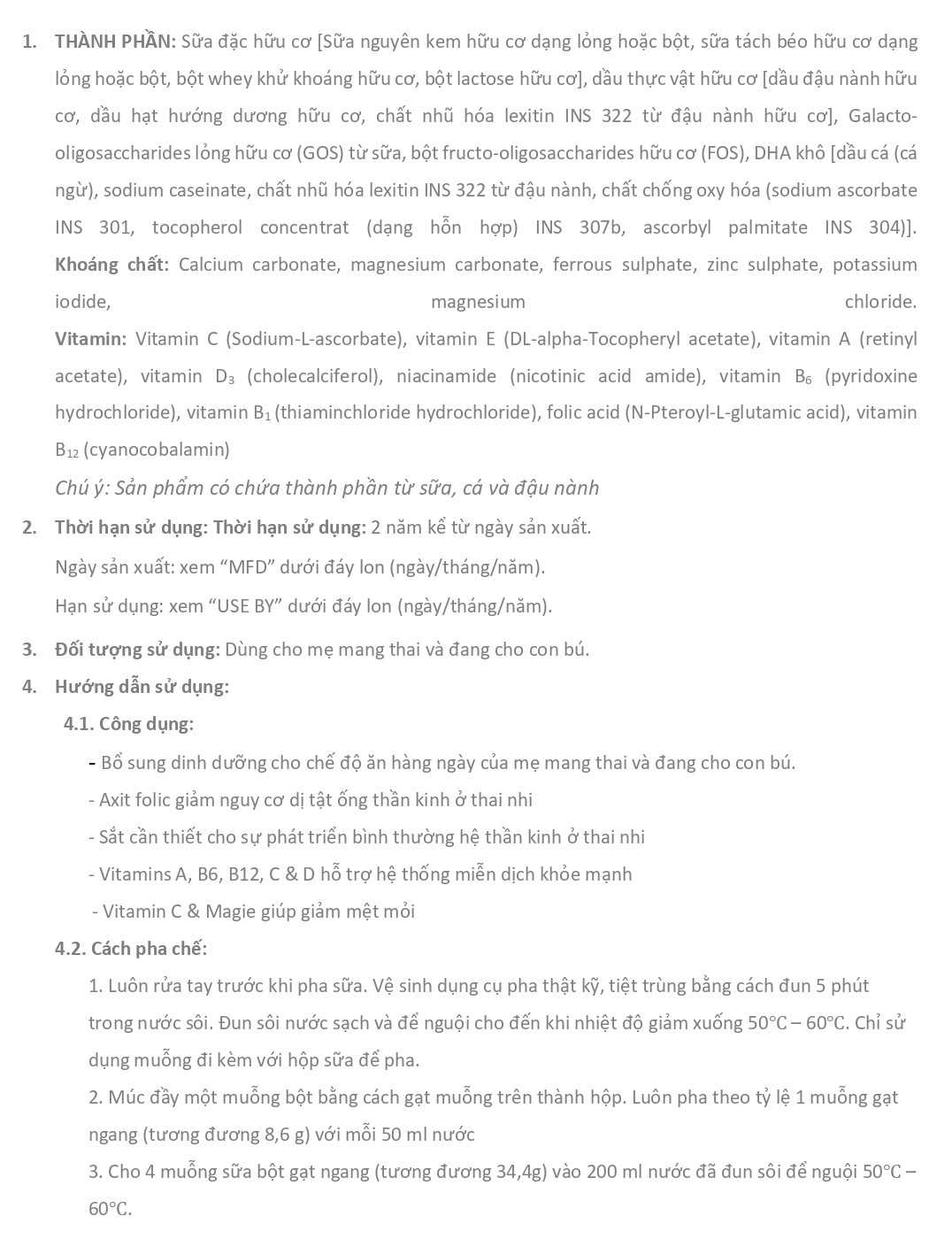Sữa đặc hữu cơ [Sữa nguyên kem hữu cơ dạng lỏng hoặc bột, sữa tách béo hữu cơ dạng lỏng hoặc bột, bột whey khử khoáng hữu cơ, bột lactose hữu cơ], dầu thực vật hữu cơ [dầu đậu nành hữu cơ, dầu hạt hướng dương hữu cơ, chất nhũ hóa lexitin INS 322 từ đậu nành hữu cơ], Galacto-oligosaccharides lỏng hữu cơ (GOS) từ sữa, bột fructo-oligosaccharides hữu cơ (FOS), DHA khô [dầu cá (cá ngừ), sodium caseinate, chất nhũ hóa lexitin INS 322 từ đậu nành, chất chống oxy hóa (sodium ascorbate INS 301, tocopherol concentrat (dạng hỗn hợp) INS 307b, ascorbyl palmitate INS 304)].