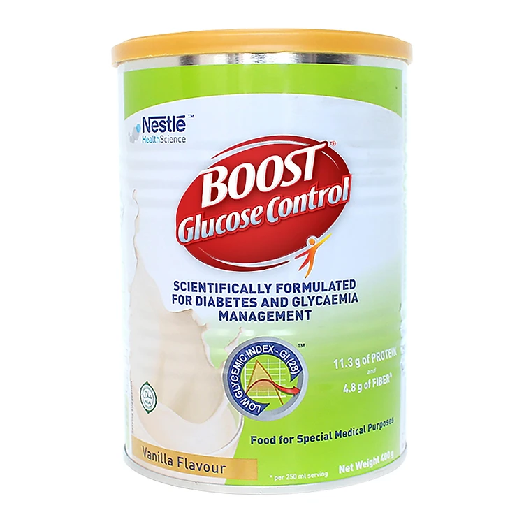- Sữa Dinh Dưỡng Nestle Boost Glucose Control (400g) là thực phẩm dinh dưỡng y học cân bằng và hoàn chỉnh được chỉ định cho chế độ ăn của người đái tháo đường, sự gia tăng đường huyết hoặc là tiền đái tháo đường. Với chỉ số đường huyết thấp đáp ứng khuyến nghị quốc tế (GI=28) không chứa đường glucose, fructose, phù hợp cho người bệnh đái tháo đường hoặc có đường huyết cao. Sản phẩm có thể uống trực tiếp hoặc nuôi ăn qua ống thông.
