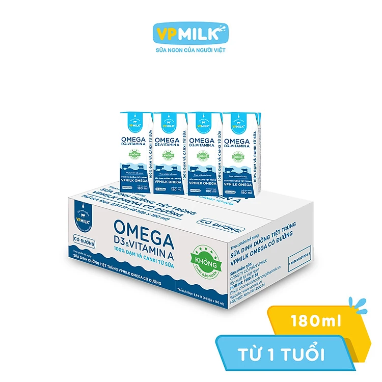 Sữa Dinh Dưỡng Tiệt Trùng VPMilk Omega Có Đường dạng hộp cho bé trên 1 tuổi 180ml (thùng 48 hộp)