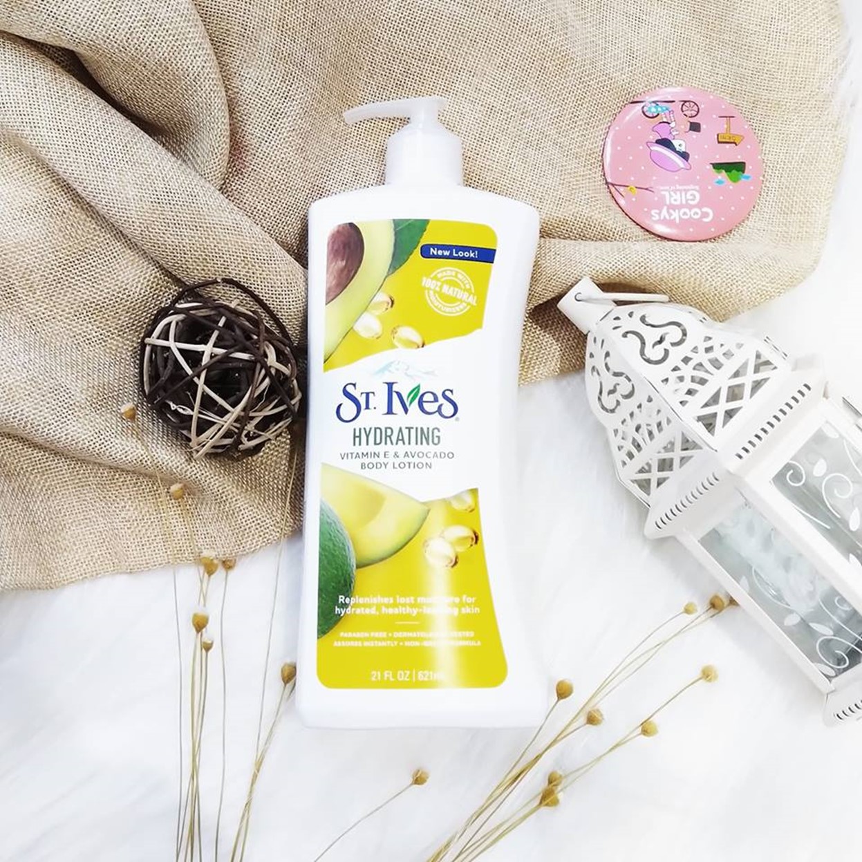 - Sữa Dưỡng Thể ST.IVES Hydrating Vitamin E & Avocado Body Lotion với công thức thẩm thấu nhanh và không nhờn, tăng cường vitamin E chống lão hóa, ngăn ngừa khô da, cải thiện làn da tươi khỏe trông thấy. Ngoài ra sản phẩm còn chứa chiết xuất bơ giúp tăng cường độ ẩm mịn trên làn da của bạn.