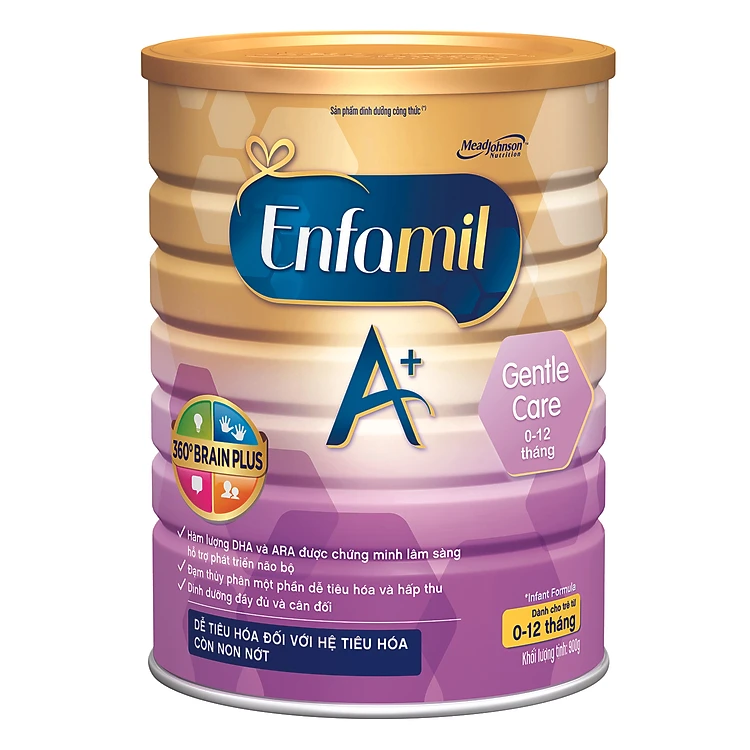 - Sữa Enfamil A+ Gentle Care 360 Brain Plus (900g) cho trẻ từ 0 - 12 tháng với công thức 360° BRAIN PLUS thay thế bữa ăn cho trẻ mất sữa mẹ hoặc thiếu sữa mẹ. Giúp bổ sung vi chất dinh dưỡng cần thiết cho chế độ ăn hàng ngày, hỗ trợ sự phát triển toàn diện của trẻ.