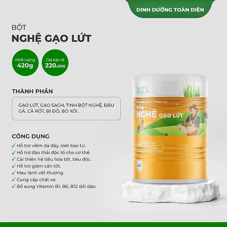 Bột sữa nghệ gạo lứt mang hương vị ngọt thơm tự nhiên từ các loại đậu hạt rau củ giàu chất xơ, vitamin. Sản phẩm hỗ trợ cho người bệnh gặp các vấn đề liên quan đến dạ dày, loét bao tử, hỗ trợ đào thải các chất không tốt cho cơ thể, cải thiện hệ tiêu hóa tốt, hỗ trợ giảm cân tốt.