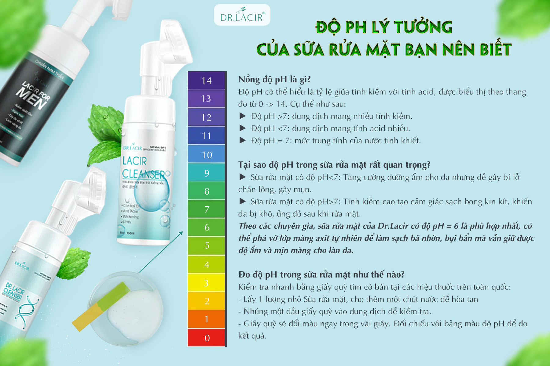 Bộ 3 sữa rửa mặt Dr lacir đều có độ pH = 6, phù hợp nhất với da, có thể phá vỡ lớp màng axit tự nhiên để làm sạch bã nhờn, bụi bẩn mà vẫn giữ được độ ẩm và mịn màng cho làn da.