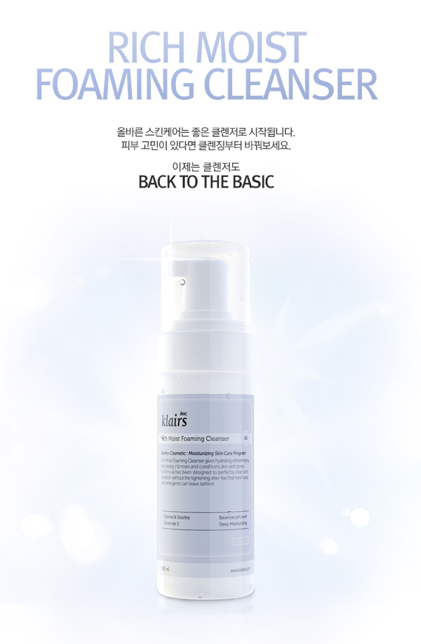 Sữa Rửa Mặt Dạng Bọt Dưỡng Ẩm Da Klairs Rich Moist Foaming Cleanser chứa HA, Ceramide 3 & tinh dầu oliu cùng cùng các thành phần chiết xuất từ tinh dầu thực vật như bưởi, tràm trà, bơ hạt mỡ giúp tăng cường khả năng giữ ẩm cho làn da sau khi sử dụng. Công thức hoạt tính từ Amino Acid, là thành phần có trong Protein và đặc biệt không chứa chất tẩy rửa sẽ làm sạch sâu tận trong lỗ chân lông, cân bằng độ pH da mà không gây nên hiện tượng kích ứng, kể cả làn da nhạy cảm.