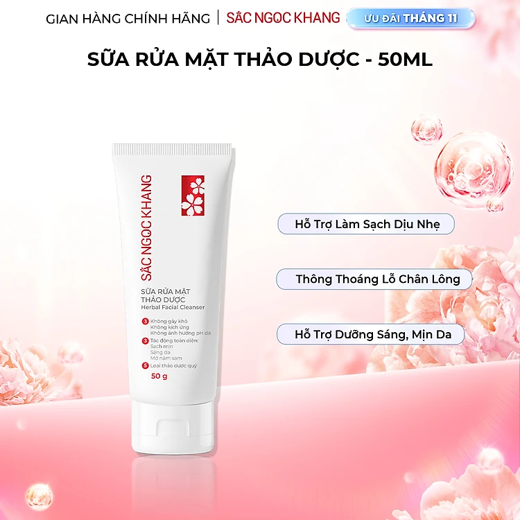 Sữa rửa mặt Sắc Ngọc Khang 50g giúp loại bỏ bụi bẩn và bã nhờn dư thừa, cung cấp các dưỡng chất cho da, giúp da trắng sáng, mịn màng