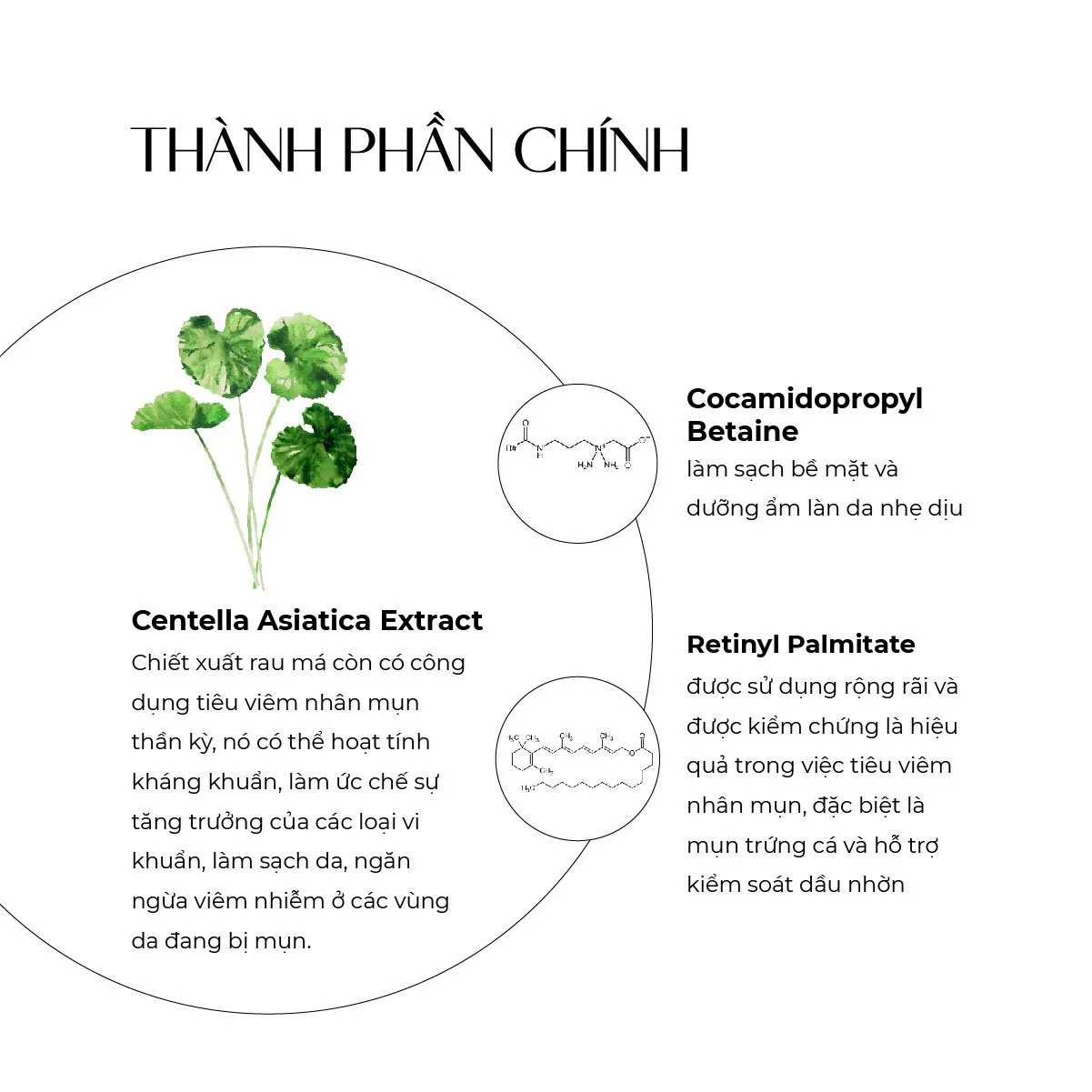- Centella Asiatica Extract: chiết xuất từ cây rau má có khả năng kích hoạt quá trình phân chia tế bào và kích thích sự tổng hợp collagen của mô liên kết. Ngoài ra, chiết xuất rau má còn có công dụng ngừa mụn thần kỳ, làm ức chế sự tăng trưởng của các loại vi khuẩn, làm sạch da, ngăn ngừa nhiễm trùng ở các vùng da đang bị mụn.