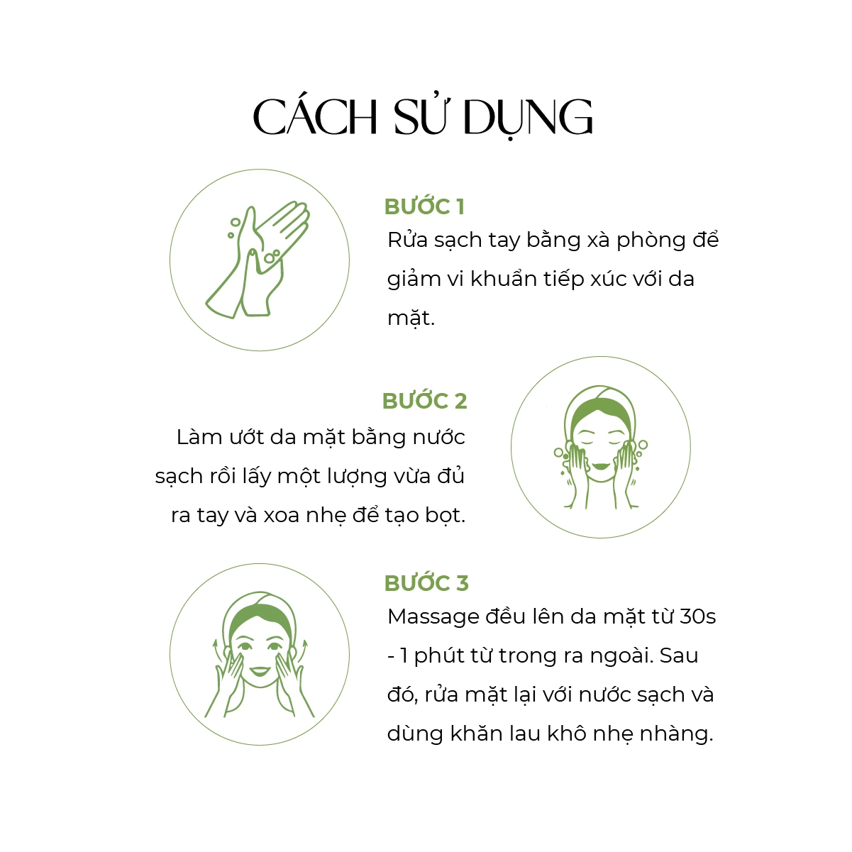 Bước 3: Massage đều lên da mặt từ 30s - 1 phút từ trong ra ngoài. Sau đó rửa mặt lại với nước sạch và dùng khăn khô lâu nhẹ nhàng.