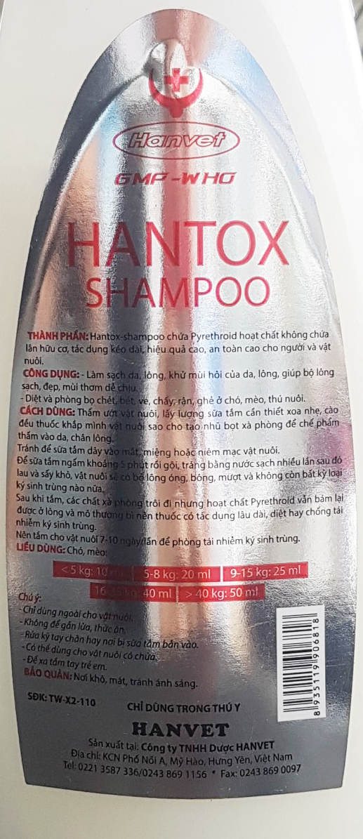 Hantox-shampoo chứa Pyrethroid [(1R,3R)-3(2,2-dibromovinyl)-2,2-dimethylcyclorpropane carbocylate(S)-α-cyano-3-phenoxybenzyl] hoạt chất không chứa lân hữu cơ nên ít độc, tác dụng kéo dài, hiệu quả cao, an toàn cho người, vật nuôi.