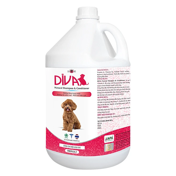 Sữa tắm cho chó DIVA công thức 2 đặc biệt phù hợp cho các giống chó như Poodle, Chihuahua, Labrador, Pug, Bull, Phóc sóc, Phóc hươ Dùng được cho cả chó lông trắng và chó lông màu.