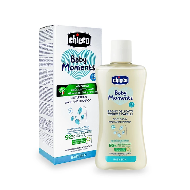 Sữa TẮM GỘI CHICCO Baby Moments Chiếc Xuất Yến Mạch Dưỡng Ẩm Mềm Da Chống Rôm Sảy, từ 0 Tháng Tuổi, chai 200ml/500ml