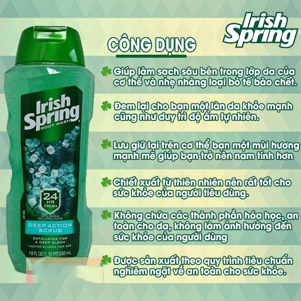 - Irish Spring Body Wash được xem là dòng sản phẩm làm sạch da. Không chỉ sở hữu khả năng làm sạch mạnh mẽ, sản phẩm còn tạo ra độ lưu hương và mùi thơm quyến rũ trong suốt 24 giờ.