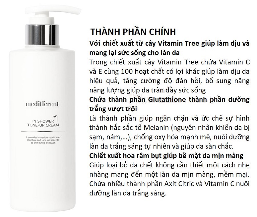 - Bên cạnh làm sạch da như các loại sữa tắm thông thường, Sữa Tắm Truyền Trắng Medifferent In Shower Tone Up Cream còn có nhiều dưỡng chất có tác dụng chăm sóc da, cân bằng độ ẩm. Sản phẩm thật thích hợp với các cô nàng hiện đại bị hạn chế về thời gian. Không cần kem dưỡng thể, không cần mất thời gian thoa kem, làm sạch…ạn vẫn có thể sở hữu một làn da trắng đẹp mịn màng.