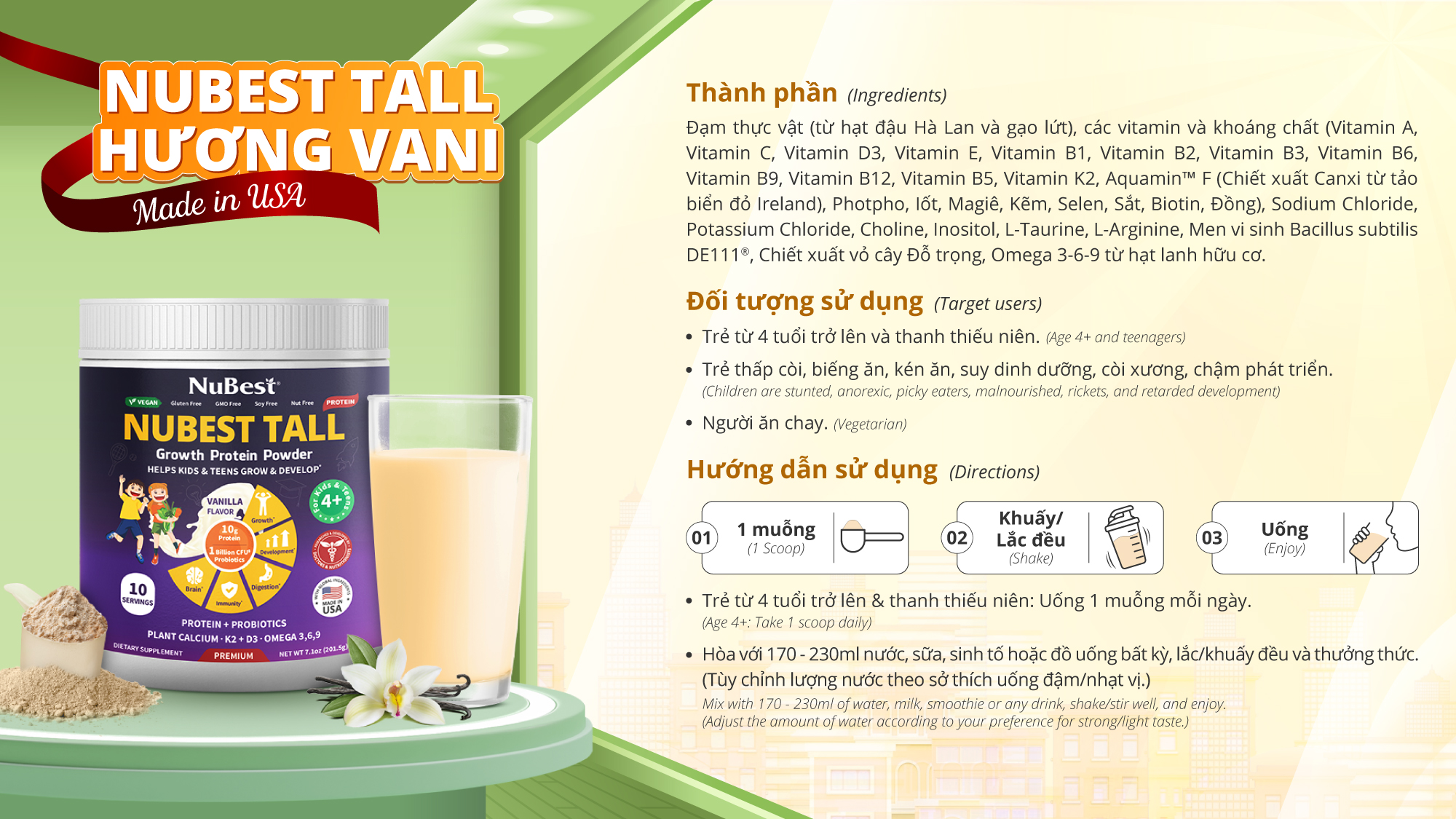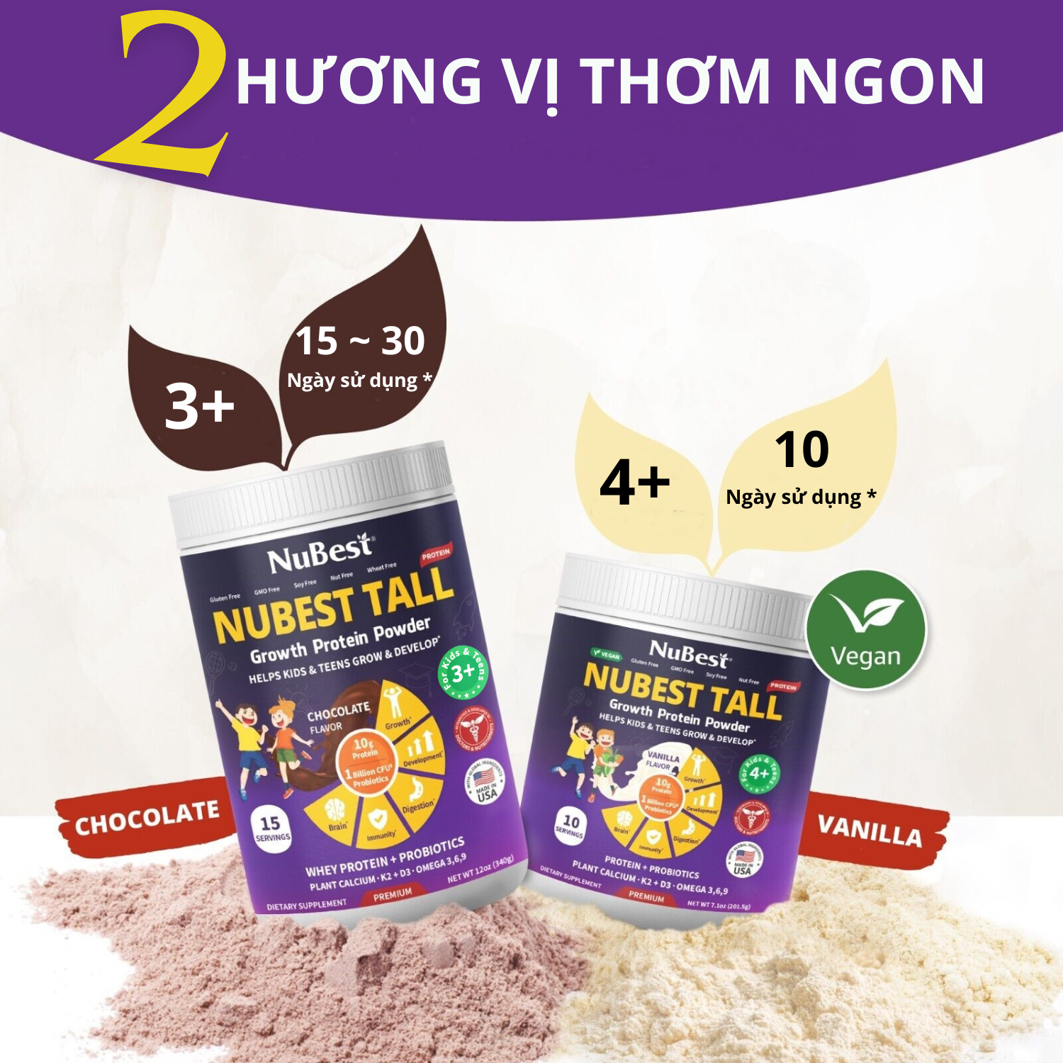 SỮA BỘT NUBEST TALL (HƯƠNG VANILLA) dành cho độ tuổi từ 4 trở lên - Thực phẩm bổ sung chất đạm từ thực vật, men vi sinh, omega 3-6-9, Canxi từ tảo biển đỏ Ireland (Aquamin F), cùng các vitamin và khoáng chất thiết yếu, hỗ trợ phát triển xương, nâng cao miễn dịch và chăm sóc sức khỏe toàn diện.