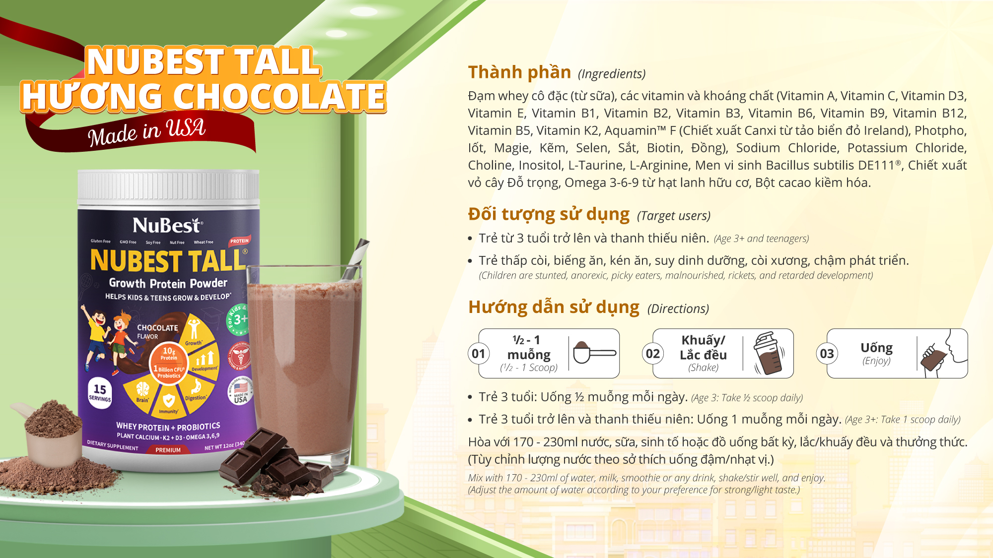 SỮA BỘT NUBEST TALL (HƯƠNG CHOCOLATE) dành cho độ tuổi từ 3 trở lên: Bổ sung chất đạm, men vi sinh, omega 3-6-9, Canxi từ tảo biển đỏ Ireland (Aquamin F) cùng các vitamin và khoáng chất thiết yếu, hỗ trợ phát triển xương, nâng cao miễn dịch và chăm sóc sức khỏe toàn diện.