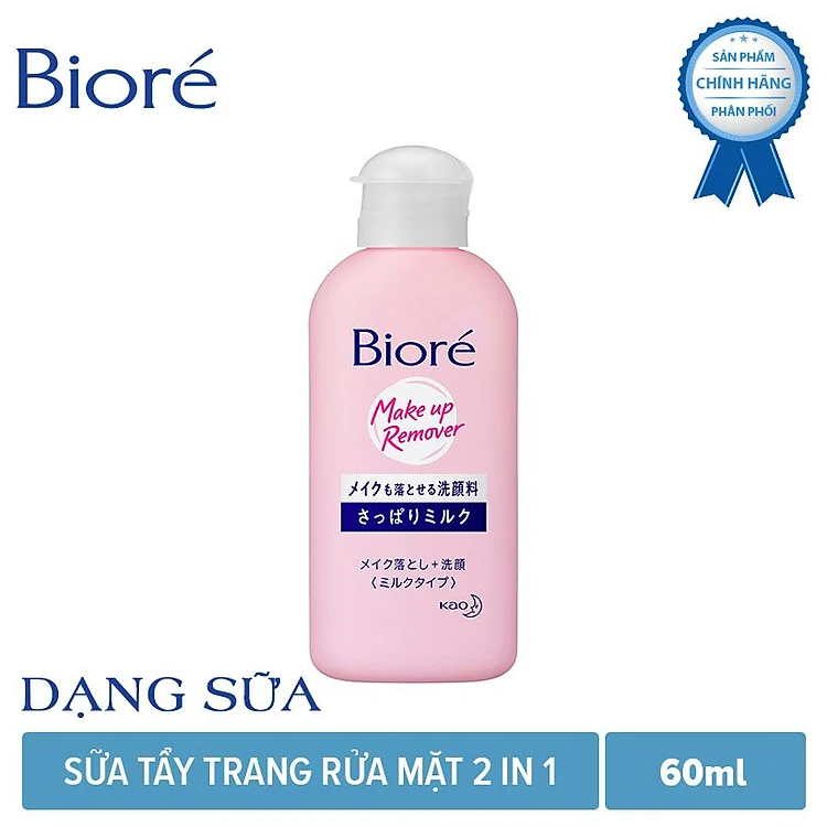 - Sữa Tẩy Trang 2 Trong 1 Bioré 2 In 1 Milky Make Up Remover (60ml) dạng sữa tạo bọt nhanh làm sạch sâu cả bã nhờn và lớp nền trang điểm mỏng, cho cảm giác tươi mát sau khi sử dụng.