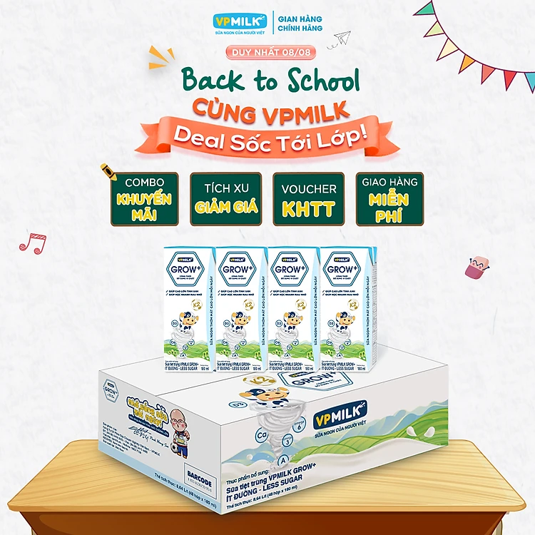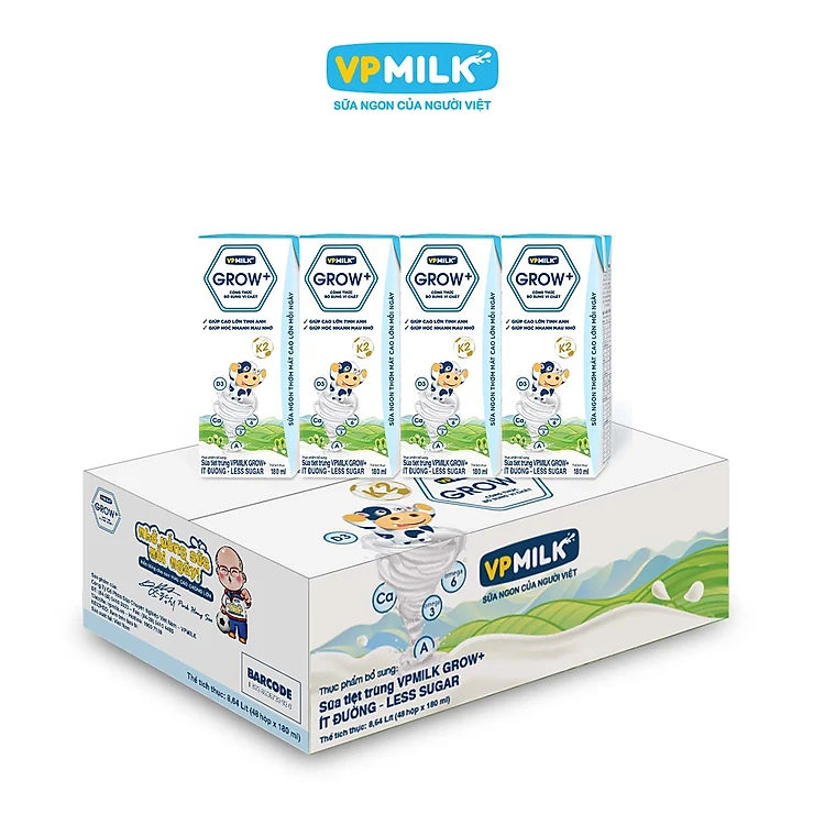 Sữa Tiệt Trùng Ít Đường VPMilk Grow+ Hộp 180ml (Thùng 48 Hộp)