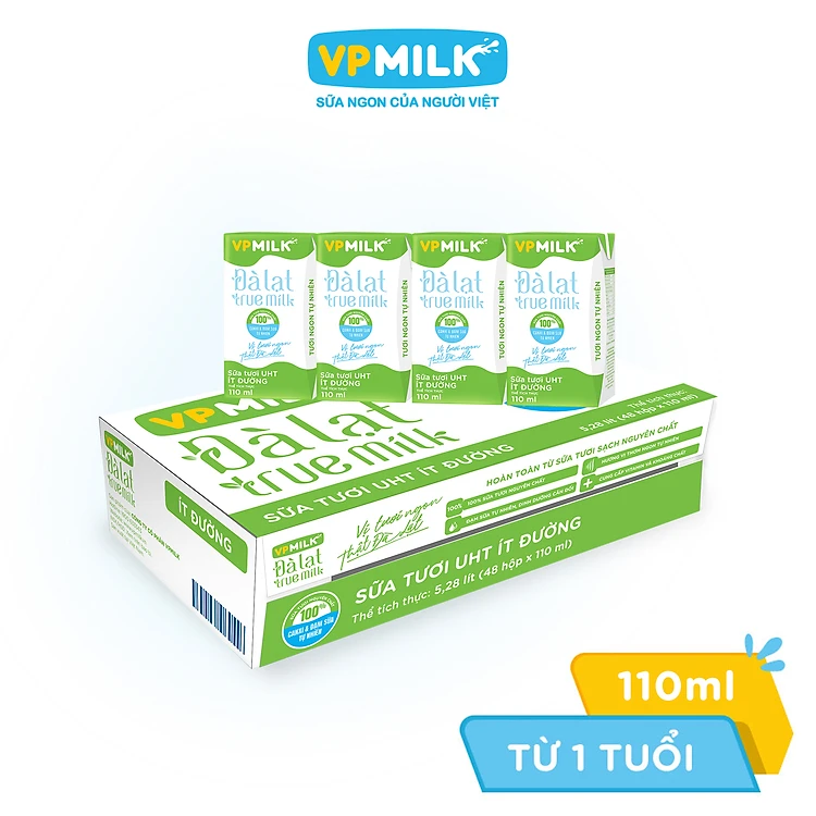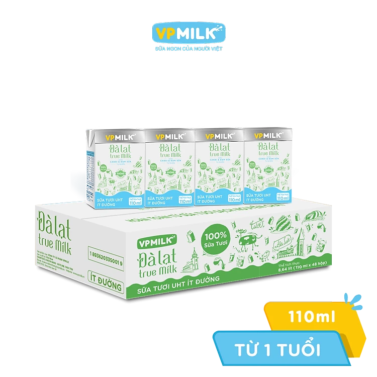 Sữa tươi UHT Đà Lạt True Milk ít đường 110ml (Thùng 48 hộp)