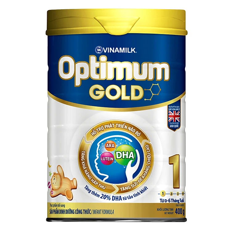 - Sữa Vinamilk Optimum Gold Cho Bé Từ 0 Đến 6 Tháng Tuổi (400g) chất lượng được công nhận bởi UKAS - Anh Quốc, với công thức để hấp thu này được bổ sung thêm 20% DHA từ tảo tinh khiết, kết hợp cùng Lutein giúp trẻ phát triển não bộ vượt trội, tăng khả năng nhận thức và học hỏi.