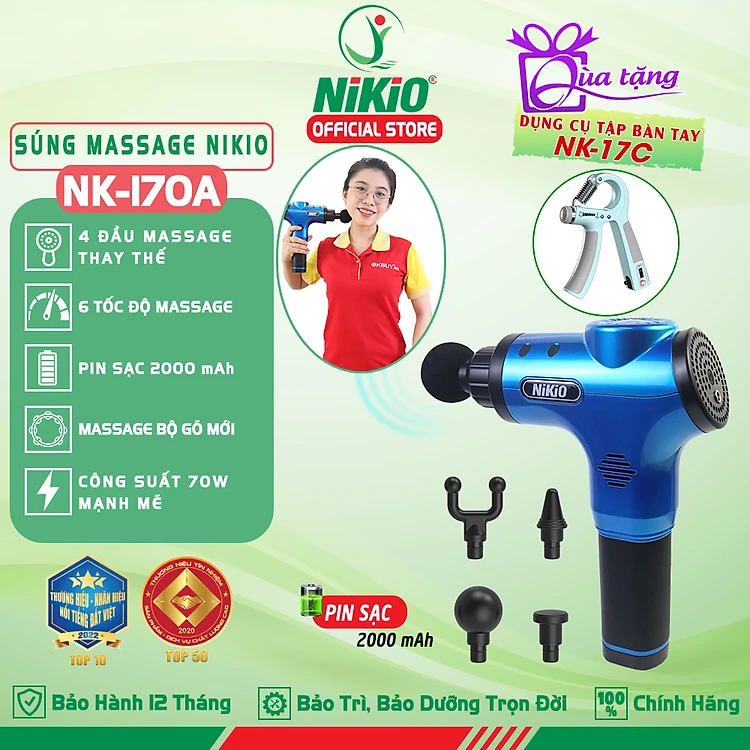 Súng (Máy) Massage Cầm Tay Nikio NK-170A - Kỹ Thuật Mát Xa Gõ Hiện Đại, Tác Động Sâu, Hỗ Trợ Giãn Cơ Toàn Thân - 4 Đầu Thay Thế, 6 Cấp Độ Mát Xa, Pin Sạc Không Dây 2000 mAh