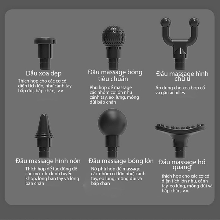 Bộ sản phẩm đi kèm với 6 đầu massage chuyên dụng được nghiên cứu và thiết kế dựa trên cơ chế hoạt động của các vận động viên, dân tập thể hình, người lao động với cường độ cao. Các đầu massage thích ứng hoàn hảo với từng nhóm cơ, từng bộ phận trên cơ thể khác nhau, hỗ trợ nhằm mang đến hiệu quả massage cao nhất cho người dùng. Giúp giảm căn cơ, săn chắc các nhóm cơ nơi các đầu tác động. Với từng đầu có kiểu dáng khác nhau cho sự tác động cũng như hiệu quả mát xa khác nhau mà đầu đó tác động vào (Công dụng của các đầu có chú thích hình dưới).