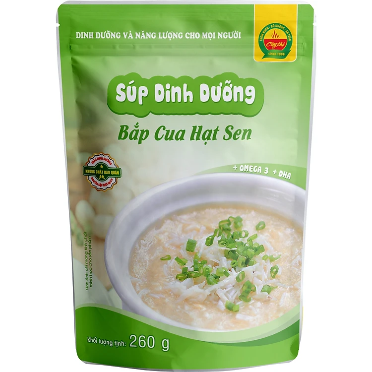 Súp Bắp cua hạt sen thương hiệu Cây Thị với hương vị thơm ngon từ thịt bắp cua, vị bùi ngọt của hạt sen là một trong các món ăn cuối tuần được ưa chộng nhất trong các sản phẩm chất lượng thương hiệu Cây Thị. Súp bắp cua hạt sen Cây Thị là sản phẩm thích hợp cho trẻ em, người lớn mệt mỏi vì dễ tiêu hóa mà lại bổ dưỡng.