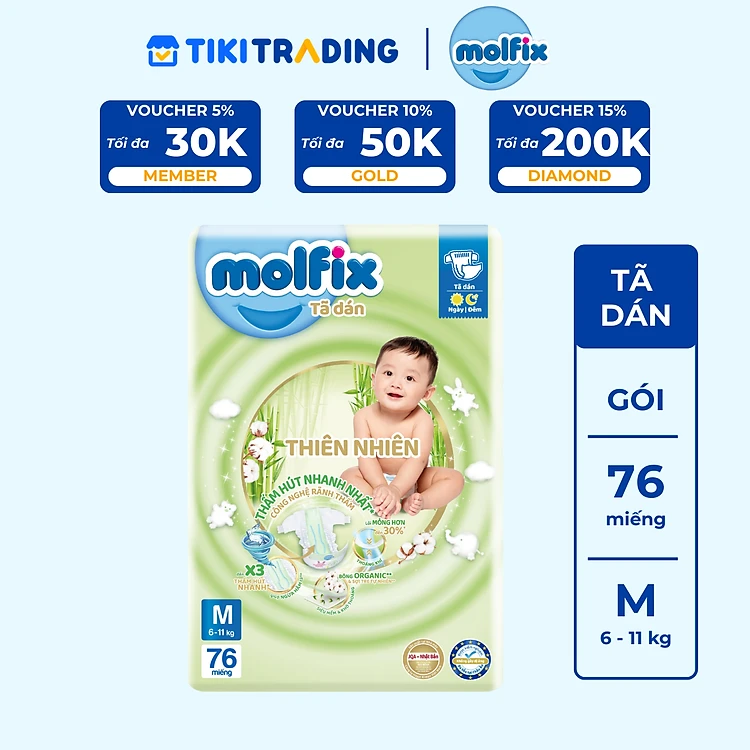 Tã/bỉm dán Molfix Thiên nhiên Super Jumbo M (6kg - 11kg) - Gói 76 miếng