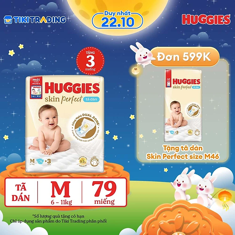 Tã/bỉm dán sơ sinh Huggies Skin Perfect M 76+3 miếng với 2 vùng thấm giảm kích ứng da