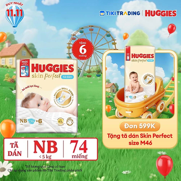 Tã/bỉm dán sơ sinh Huggies Skin Perfect NB 70+4 miếng với 2 vùng thấm giảm kích ứng da