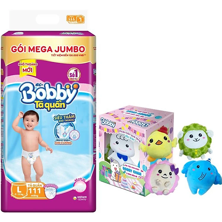 Tã/Bỉm Quần Gói Mega Jumbo Bobby Siêu Thoáng L111 - [Tặng Hộp Đồ Bông 5 Món Đặc Biệt Bobby Chan & 4 Người Bạn]