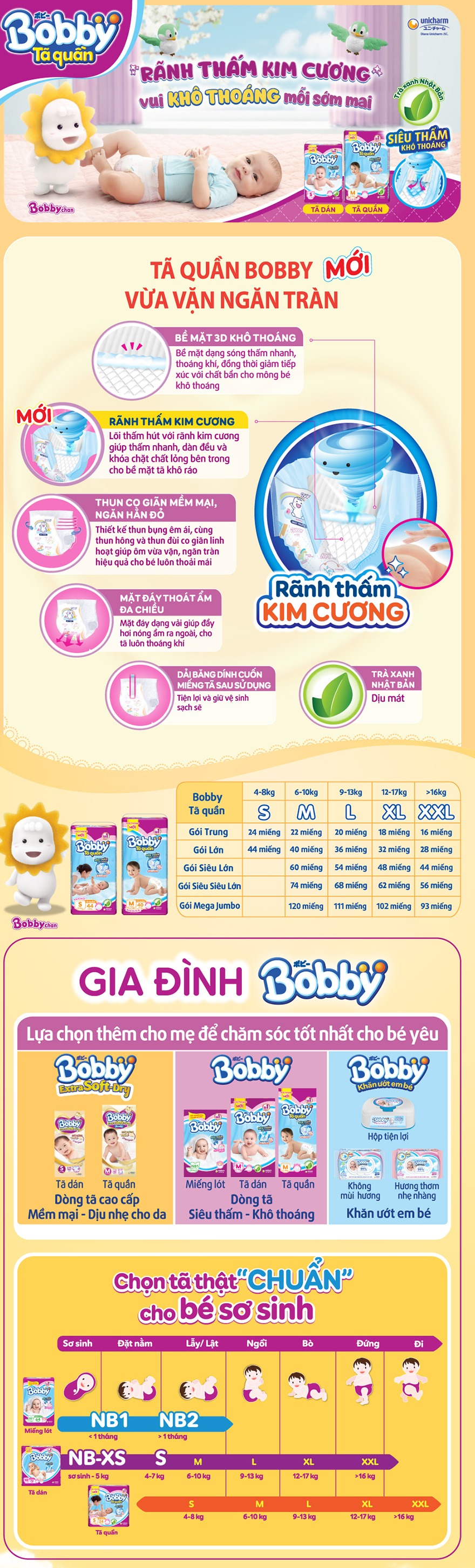 Tã Quần Bobby Gói Mega Jumbo sẽ là lựa chọn hoàn hảo của mẹ cho bé trong những năm tháng đầu đời. Với lưng thun linh hoạt 3 vùng cùng bề mặt 3D thông minh, mặt đáy siêu thấm chống tràn, thoát ẩm đa chiều, tã quần Bobby mang đến cho bé những vận động thoải mái, cảm giác dễ chịu để tự do khám phá thế giới xung quanh cũng như phát triển toàn diện về thể chất và trí não.
