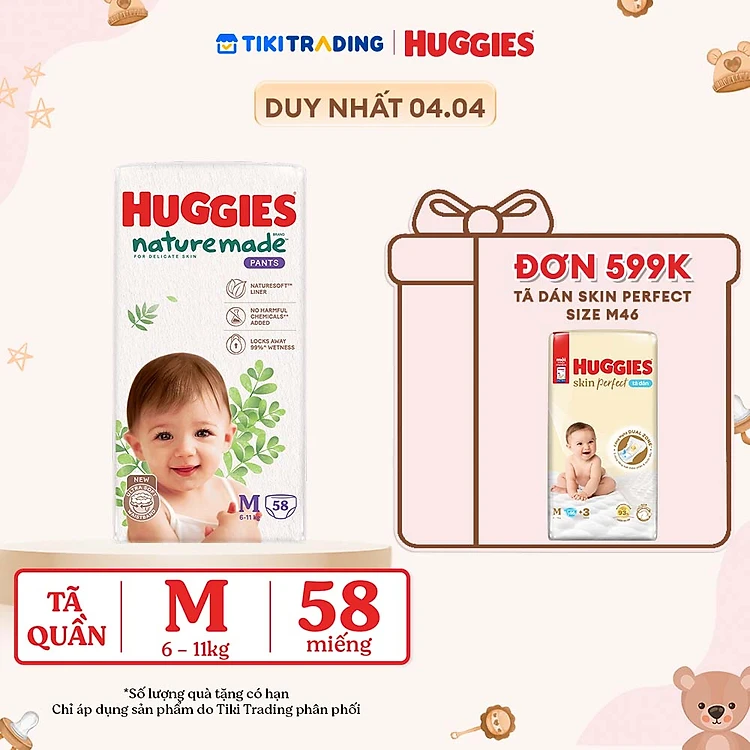Tã/bỉm quần Huggies Naturemade M58/L44/XL38/XXL26