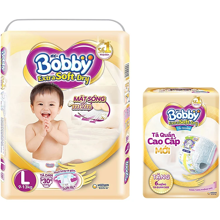 Tã Dán Bobby Extra Soft Gói Đại L30 (30 Miếng) + Tặng thêm 6 miếng