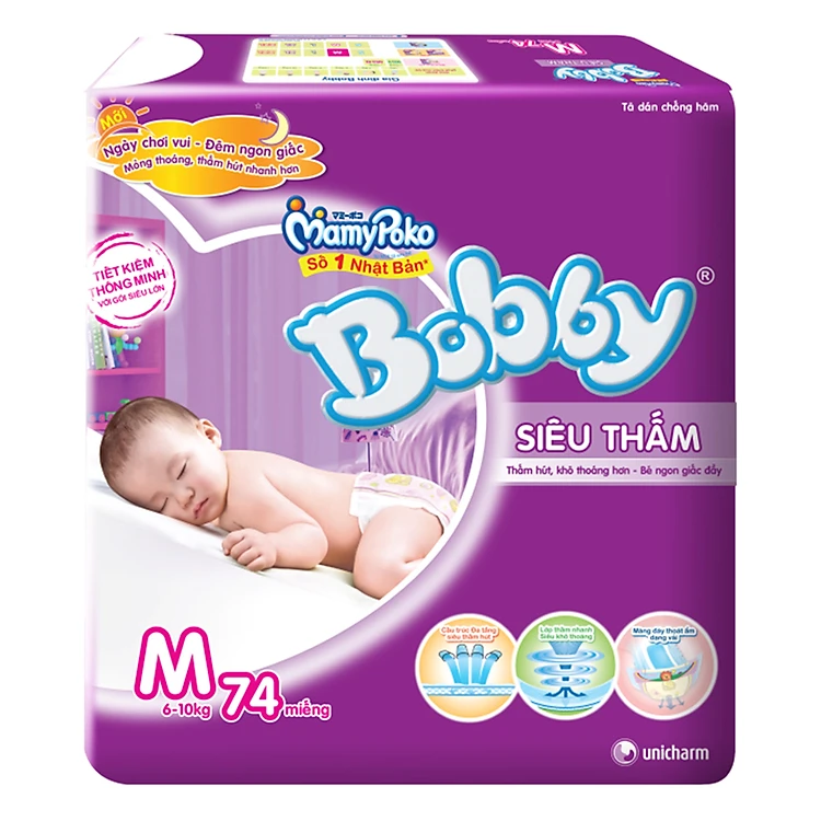 Tã Dán Bobby Fresh Siêu Thấm Gói Cực Đại M74 (74 Miếng)