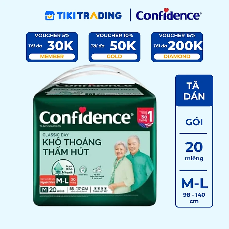Tã dán người lớn Confidence Classic Day khô thoáng thấm hút size M/L gói 20 miếng