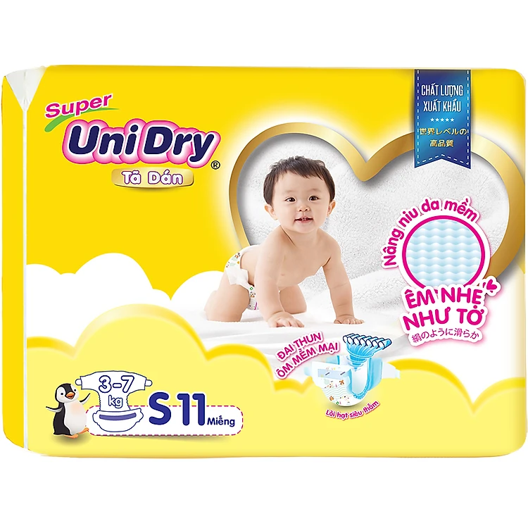Tã Dán UniDry Super S11 (11 Miếng) được đóng gói 11 miếng, thích hợp dành cho bé nặng từ 3-7kg. Sản phẩm có nhiều tính năng vượt trội với khả năng thấm hút tăng 25%, đai lưng co giãn linh hoạt và miếng dán tiện dụng mang đến cho bé cảm giác dễ chịu và thoải mái khi vận động. Sản phẩm sẽ là một lựa chọn lý tưởng được nhiều gia đình tin dùng.