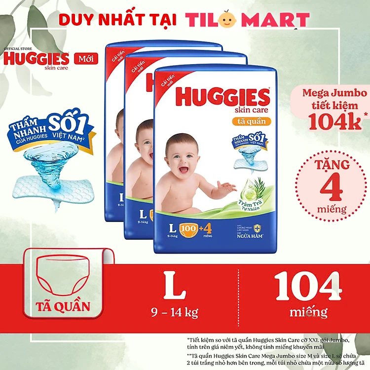 [TẶNG THÊM MIẾNG CHO SIZE L/XL/XXL] Combo 3 gói Tã quần Huggies Skincare Mega Jumbo M106/L96/XL84/XXL76