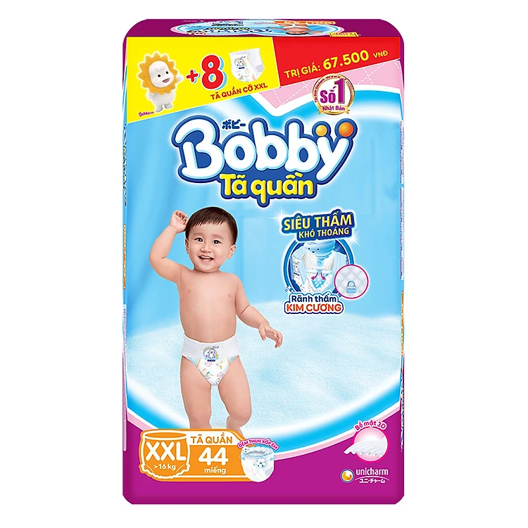 Tã Quần Bobby Gói Siêu Lớn XXL44 (44 Miếng) + 8 Miếng Cùng Size