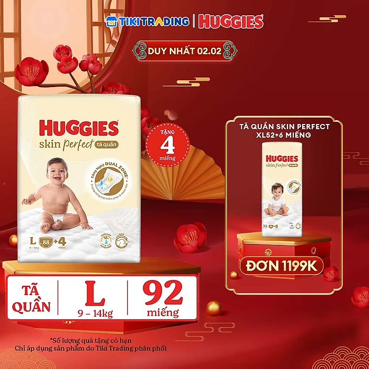 Tã quần Huggies Skin Perfect Mega Jumbo L88+4 miếng với 2 vùng thấm giảm kích ứng da