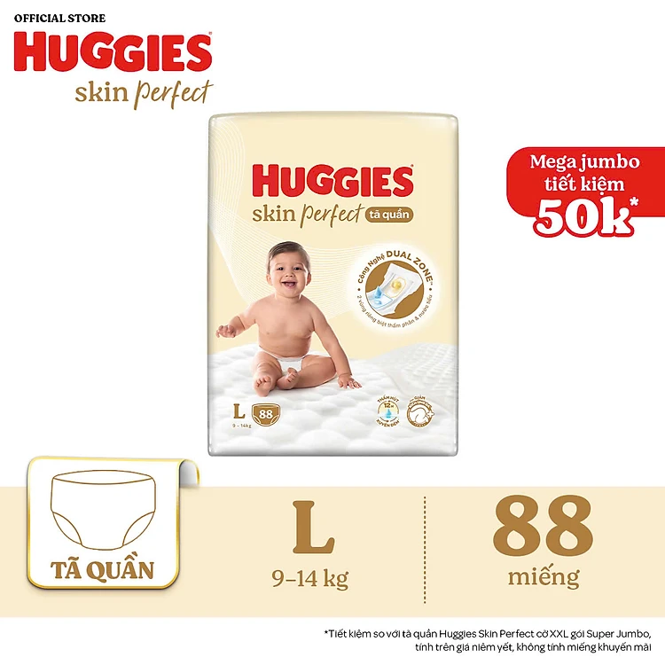 Tã quần Huggies Skin Perfect Mega Jumbo L88 miếng với 2 vùng thấm giảm kích ứng da