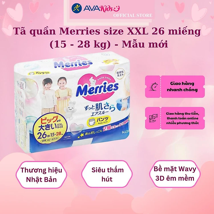 Tã quần Merries size XXL 26 miếng (15 - 28 kg) - Mẫu mới sở hữu bề mặt Wavy 3D êm mềm, thoáng khí giúp làm giảm diện tích tiếp xúc giữa da bé và bề mặt tã, ngăn ngừa hăm tã ở bé.
