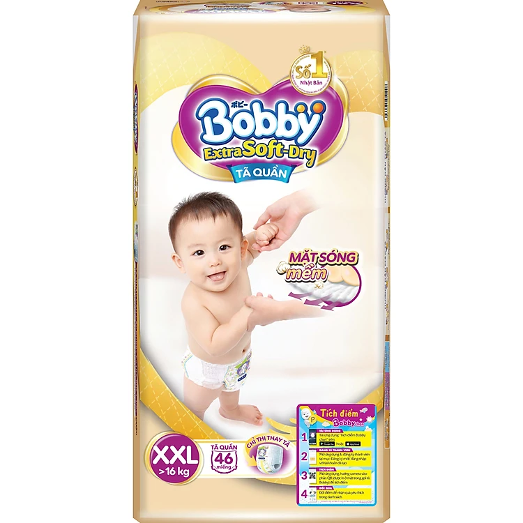 - Tã Quần Siêu Mềm Bobby Extra Soft Dry Gói Siêu Lớn XXL-46 Miếng (>16kg) là sản phẩm mới, dòng cao cấp nhất trong các dòng sản phẩm của Bobby, chất liệu mềm mại, an toàn cùng độ thấm hút, thoáng khí tốt luôn là những tiêu chí được các mẹ ưu tiên hàng đầu mỗi khi đi lựa chọn bỉm, tã cho bé.