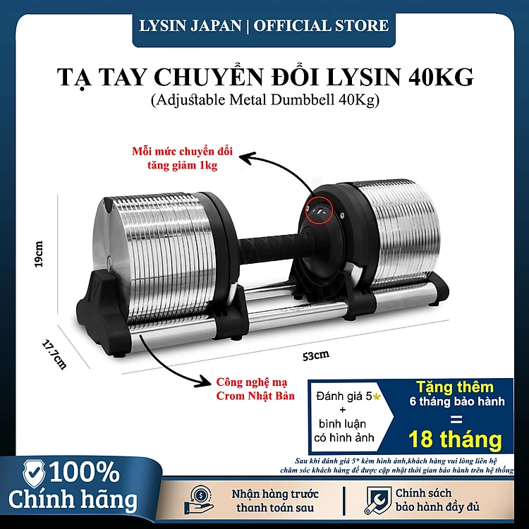Tạ Tay Điều Chỉnh LYSIN 01 quả tạ 40kg (bộ 02 quả tạ 80kg) –Tăng Giảm 1kg, Mạ Crom Chống Gỉ, Tay Cầm Cao Su Bảo Vệ Tay, Bền Bỉ Chuẩn Nhật