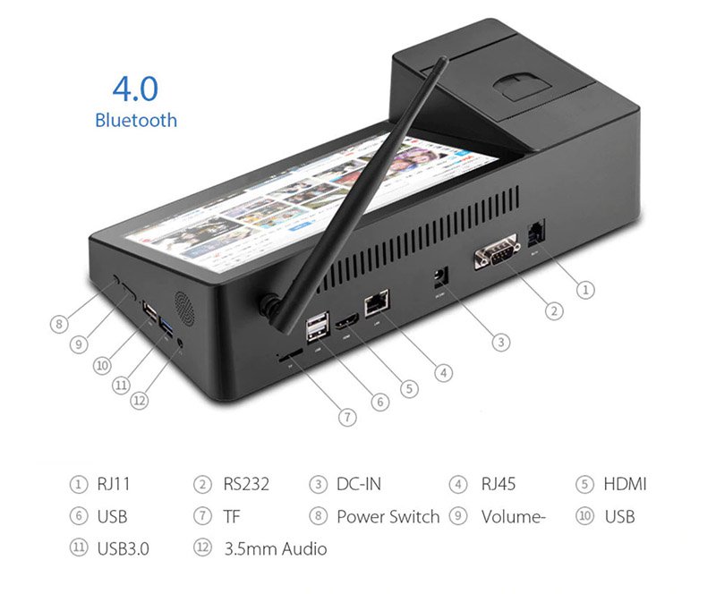 Bên cạnh việc mở rộng cổng cắm nguồn chính thì Tablet windows 10 tích hợp máy in nhiệt dùng cho máy POS Pipo X3 8.9 inchs còn mở rộng thêm nhiều cổng hỗ trợ khác nữa như: RJ11, RS232, DCIN, RJ45, HDMI, USB, TF, Power Swtich, Âm lượng, USB 3.0, Jack cắm tai nghe 3.5mm.