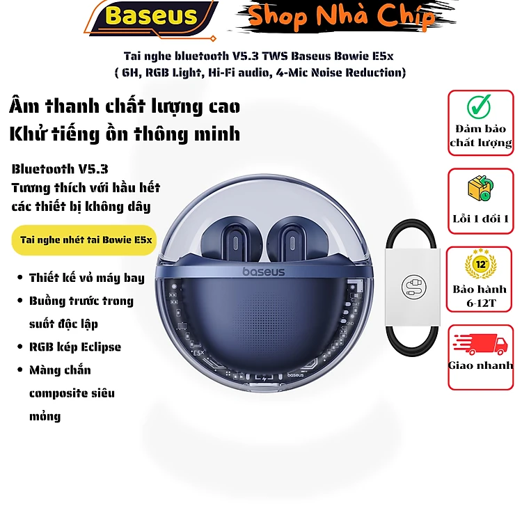 Tai nghe bluetooth V5.3 TWS Baseus Bowie E5x ( 6H, RGB Light, Hi-Fi audio, 4-Mic Noise Reduction) Hàng Chính Hãng