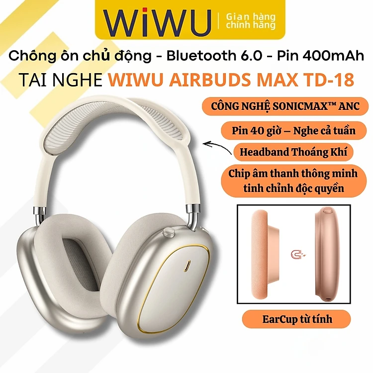 Tai nghe chụp tai bluetooth 6.0 chống ồn chủ động SonicMax ANC cao cấp WIWU Airbuds MAX TD-18 -38dB | Driver 40mm | Pin 40 Giờ | Earcups Xoay 360 | Headband Thoáng Khí - hàng nhập khẩu