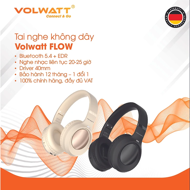 Tai nghe chụp tai không dây Volwatt Flow hàng chính hãng | Bluetooth 5.4 + EDR, AUX 3.5mm, Pin 200mAh 18h, Mic ENC, BH 12 tháng