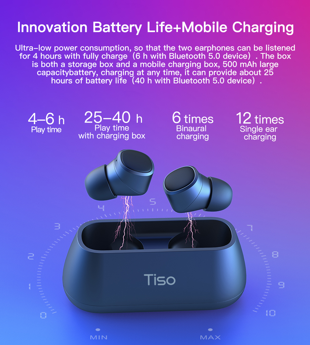 Với mỗi lần sạc đầy cho phép nghe nhạc đến 4h(6 h đối với BT 5.0). Case sạc cung cấp thêm cho tai nghe 5 lần sạc nữa nâng tổng thời gian sử dụng lên đến 24h ( 40 H đối với BT 5.0)